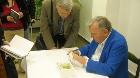Tomáš Dosoudil předal dne 17.5.2014 Erichu von Dänikenovi u příležitosti jeho přednášky v ČR dar od KPUFO.z.s.