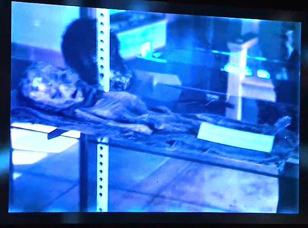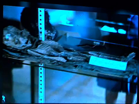 Ve vitríně leží jakási bytost, podle J. Maussana prý mrtvý mimozemšťan, sestřelený v Roswellu. Většina ufologů to však okamžitě označilo za podvod.
