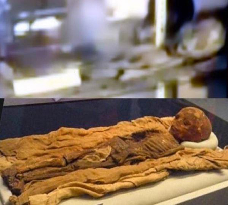 V pozadí snímku je vidět něco, co vypadá jako hlava lidoopa nebo gorily. I to dokazuje, že jde o fotografii pořízenou v muzeu, a ne fotografii mimozemšťana. I u ní je vidět podobný štítek.